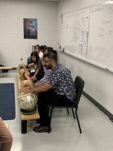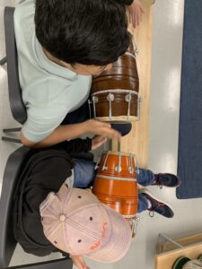 The TDSB’s Community Music Program circulates Instrument Kits to multiple schools each year-and they include some time with an Instructor/Specialist. We have the Indian Percussion Kit for this fall and Dhaivat Jani taught my seven Gr. 5-8 classes, and me, all about the Dholaks. Now these classes and I are using these drums in our concert preparation while my younger students are using them to compose. “Ta” “Ge” and “Dha” are used to communicate rhyth